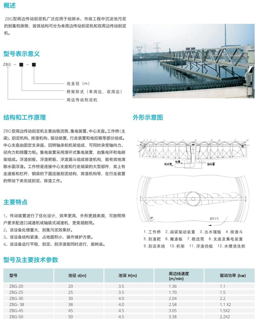 ZBG型周邊傳動(dòng)刮泥機(jī)廣泛應(yīng)用于給排水、市政工程中沉淀池污泥的刮集和排除,按其結(jié)構(gòu)可分為單周邊傳動(dòng)刮泥機(jī)和雙周邊傳動(dòng)刮泥機(jī)。