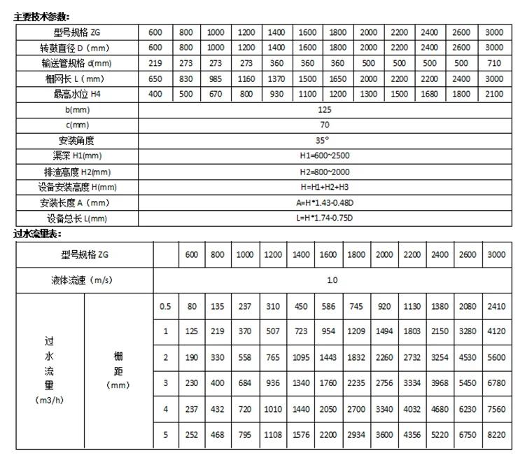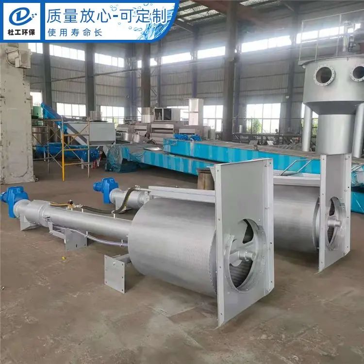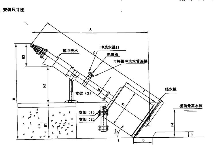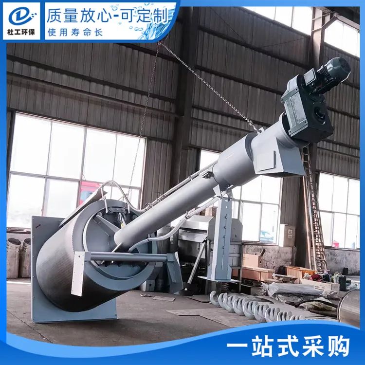 該設(shè)備采用轉(zhuǎn)鼓螺旋式,由圓形篩筒作為柵面,與水平面成35°安裝在水渠中,當(dāng)污水從格柵端頭流入篩筒內(nèi),大于柵隙的濾渣被攔截,沉積在篩筒內(nèi)表面,整個(gè)篩筒由電機(jī)驅(qū)動(dòng)旋轉(zhuǎn),篩筒上方的清渣刷與沖水機(jī)構(gòu)對(duì)篩面進(jìn)行清洗,將濾渣沖落入中央物料槽內(nèi),由輸送螺桿提升,經(jīng)壓榨、脫水后,由卸料口落入物料箱或輸送機(jī)進(jìn)行外運(yùn)處理。
